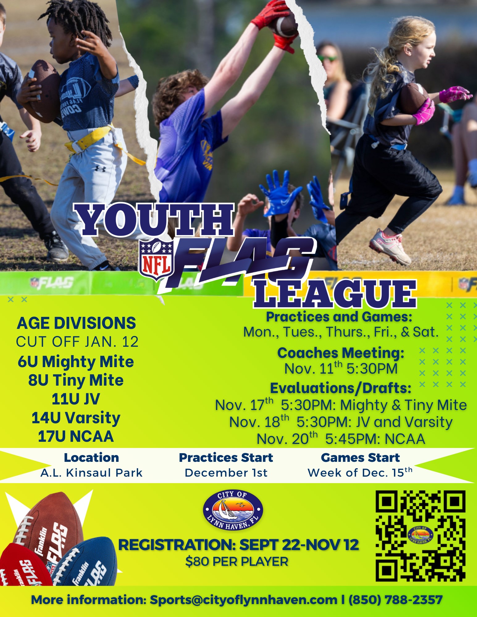 Sign up today for our Youth NFL Flag Football League! Registration opens September 22 and closes November 12, with a fee of $80 per player. Age divisions include Mighty Mite (ages 5–6), Tiny Mite (ages 7–8), JV (ages 9–11), Varsity (ages 12–14), and NCAA (ages 15–17). Practices and games will be held on Mondays, Tuesdays, Thursdays, Fridays, and Saturdays. A coaches meeting is scheduled for November 11 at 5:45 PM, followed by player evaluations and drafts—Mighty Mite and Tiny Mite on November 17 at 5:30 PM, JV and Varsity on November 18 at 5:30 PM, and NCAA on November 20 at 5:45 PM. Practices begin December 1, with games kicking off the week of December 15. The age cut-off date is January 12. Don’t miss out on a fun and competitive season of flag football!